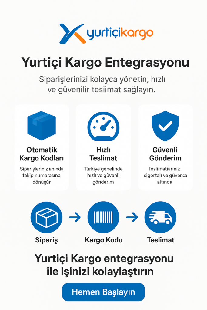 Yurtiçi Kargo entegrasyonu ile siparişleriniz otomatik olarak kargo koduna dönüşür; etiket basımı ve durum takibi tek ekranda.